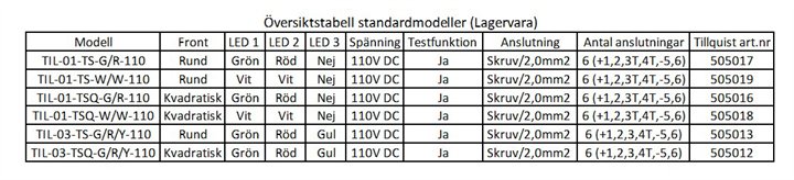 Enheterna levereras med skruvplintar som rymmer upp till 2mm2 anslutning vilket gör det mkt enkelt att sy vidare kretsen till nästa enhet utan behov av extra plintar. 110V DC är lagervara i de vanligaste utförandena. Se tabellöversikt nedan.